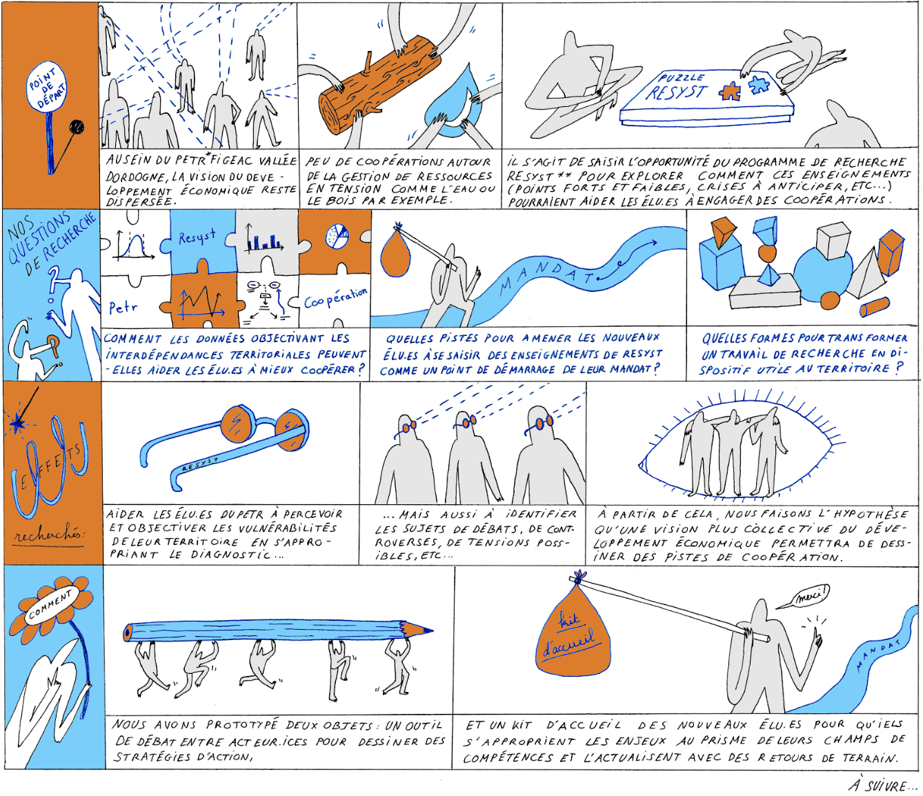Nous faisions l’hypothèse que celui-ci pourrait, en objectivant et les dynamiques, vulnérabilités et interdépendances du territoire, stimuler la coopération entre les inter-communalités. La première étape a permis de préciser nos questions : Comment compléter la perspective scientifique avec l’expérience vécue des acteurs et habitants du territoire ? Comment traduire les constats du diagnostic en défis, mais aussi en points de controverses et de débats, comme prémices à la coopérations ? Quels pistes pour élargir le cercle des élu.e.s mobilisés par la restitution, les plus convaincus déjà de la nécessité faire évoluer la vision du développement économique, à d’autres plus éloignés de ces sujets ? Dans quelle mesure le diagnostic pourrait il faire partie d’un socle commun de connaissance pour accueillir les nouveaux élu.e.s ? Comment mieux outiller la collaboration entre chercheur.se.s et acteurs publics, en amont de la production, pendant la restitution, et après ?